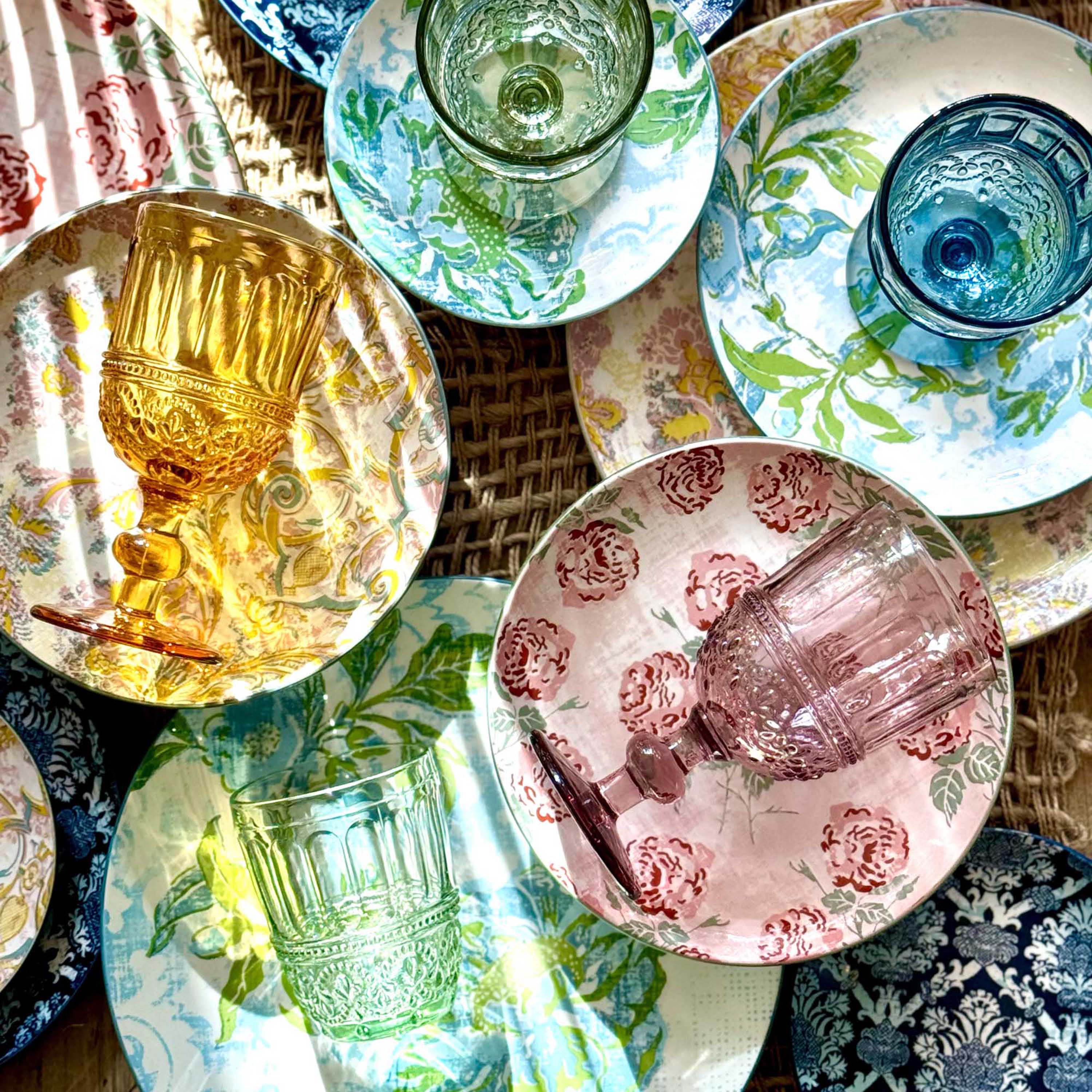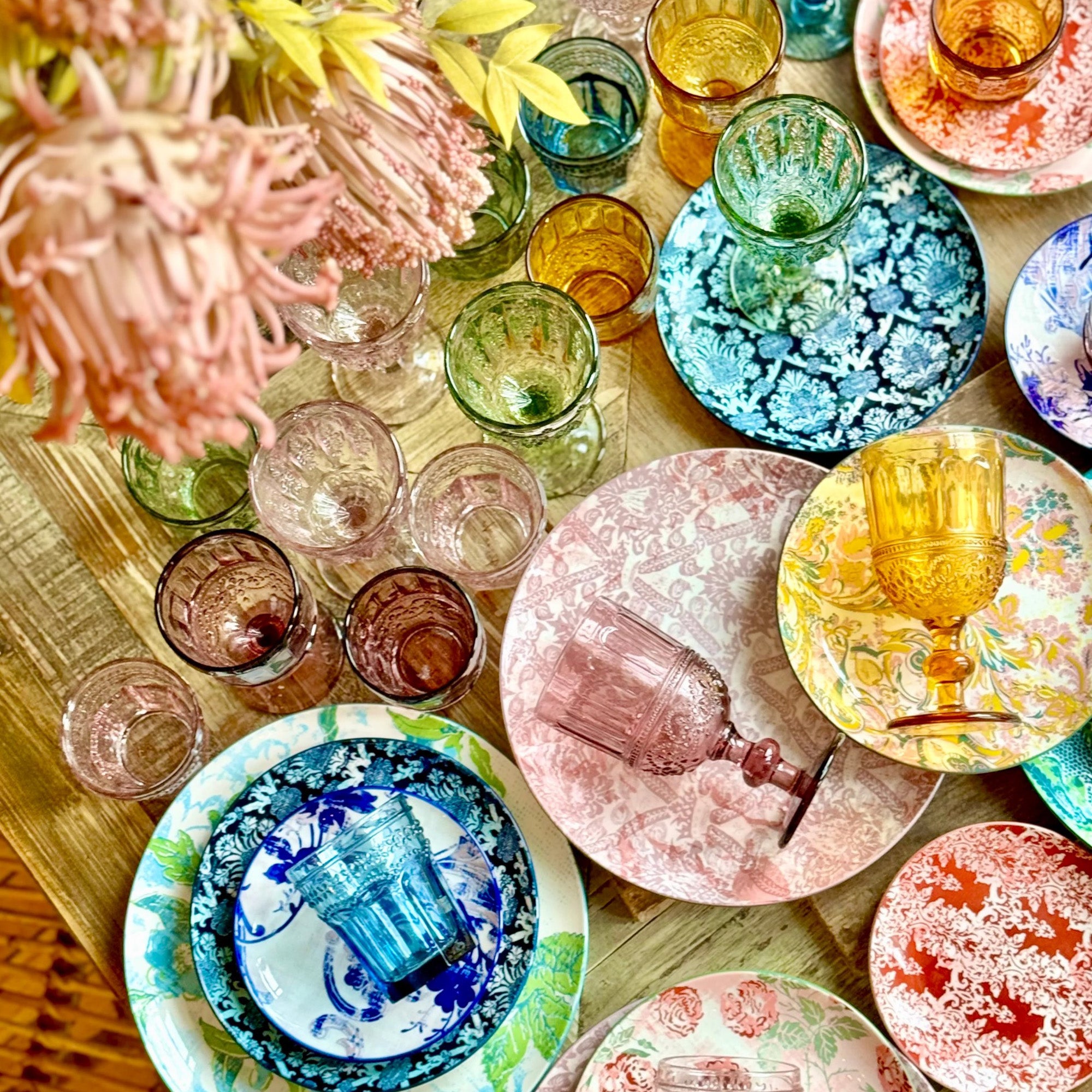 This French-colored pressed glassware collection blends seamlessly with classic and vintage table settings. The mix of goblets and tumblers elevates any occasion, from casual meals to formal gatherings. With intricate detailing and a curated color palette, these dishwasher-safe glasses add charm, style, and convenience to your table.